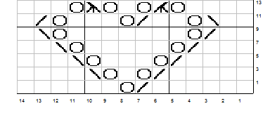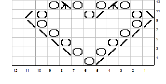 Luo 96 – 104 – 112 s ja neulo 5 krs aina oikein. Seuraavalla kerroksella yhdistä työ suljetuksi neuleeksi. Huom! Voit halutessasi käyttää reunuksessa hieman pienempiä puikkoja, niin siitä tulee napakampi.Neulo 3 – 3 – 4 krs o. Seuraavalla kerroksella aloita pitsineule ruutupiirroksen 1 – 2 – 3 mukaan. Neulo pitsineuleen kaikki kerrokset ja jatka sitten sileää neuletta, kunnes työn korkeus on noin 12 – 12 – 13 cm aloitusreunasta.