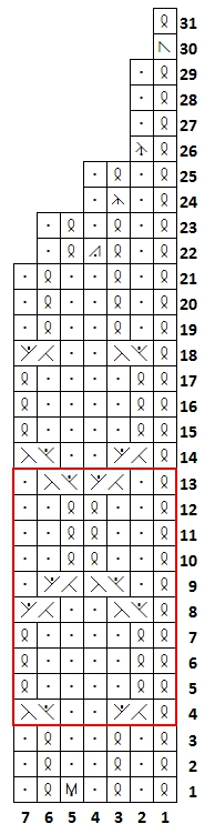 Neulo reunan joustimen jälkeen ensin kaavion kerrokset 1-13 kerran; kukin kaavion rivi toistuu 14 kertaa kerroksen aikana. Neulo tämän jälkeen kerrokset 4-13 vielä kerran ja sen jälkeen kerrokset 14-31 kerran. Katkaise lanka ja vedä langanpää jäljellä olevien silmukoiden läpi.