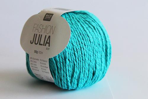 Rico Designin Fashion Julia on viisisäikeinen puuvillasekoite, jossa neljän puuvillasäikeen ympärillä kulkee viides kiiltävä tekokuituinen säie. Lanka on melko löyhäkierteinen, muttei silti tunnu neulottaessa erityisesti halkeilevan. Lanka neuloutuu kerältä helposti ja valmis neulepinta tuntuu mukavalta. Hiukan pinnasta tuntee kiiltävän säikeen kovuuden, muttei tuntumaa voi silti mitenkään raapivaksi väittää.