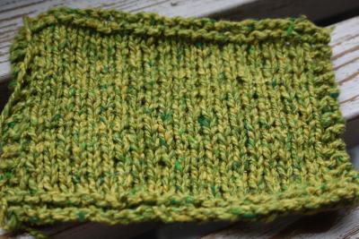 Lanka neuloutui kohtalaisen hyvin, viskoosisäie sekä epätasaisemmat kohdat hieman hidastivat välillä neulomista, mutta tästä pääsee eroon, jos ei valitse niitä puikkovalikoiman teräväkärkisimpiä yksilöitä työhön, vaan ottaa ne sieltä hieman tylpemmästä päästä. Mallitilkusta tuli suosituspuikoilla ja minun hieman löysähköllä käsialallani ehkä makuuni hieman liian löysää pintaa. Toisaalta liian tiukkaa langasta ei myöskään kannata yrittää, löysä pinta ainakin laskeutuu kauniisti. Tämä vaikutti kyllä sellaiselta langalta että suosittelen ehdottomasti mallitilkun pesua tai ainakin kastelua ennen neuleprojektin aloittamista, sillä lanka tuntui siltä, että se voi kastelun jälkeen yllättää. Hieman varoituksen sanaa siitä, että puuvilla on merseroimatonta ja hieman pehmeän oloista, niin että yhdistettynä möykkyosioihin se voi aiheuttaa langan pölyämistä ja karvaamista. Mallitilkkua neuloessani se nyt ei mitenkään merkittävissä määrin pölynnyt, ehkä hieman, mutta pölyherkkien on hyvä huomioida tämä.