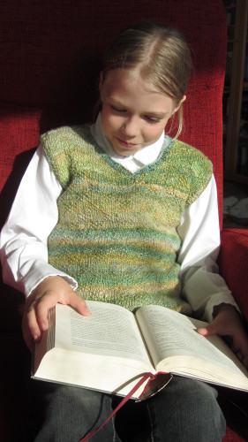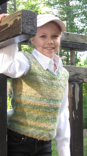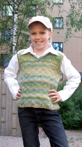 Luo 160 s. Laita halutessasi silmukkamerkki kerroksen alkuun ja 80 s päähän alusta merkitsemään liivin sivuja. Neulo 8 krs 2 o, 2 n -joustinneuletta ja jatka neulomalla mallineuletta. Neulo mallineuletta yhteensä 10 toistoa tai noin 26 cm