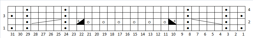 1. krs (nurja puoli): 1 o, 1 n, 1 o, 4 n, 1 o, 15 n, 1 o, 4 n, 1 o, 1 n, 1 o.