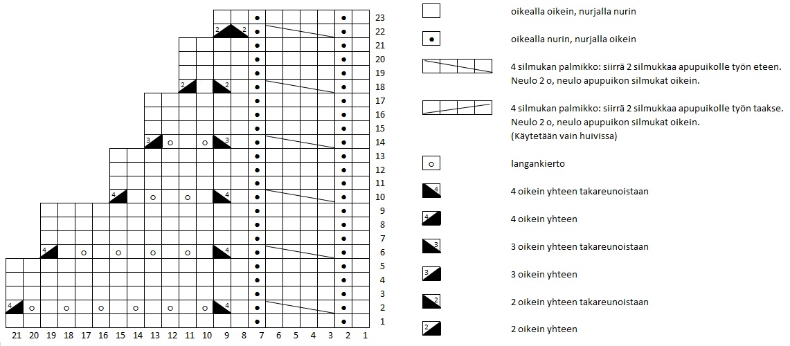 22. krs: *1 o, 1 n, siirrä 2 s apupuikoille työn eteen, neulo 2 o, neulo apupuikon silmukat o, 1 n, neulo 2 s takareunoistaan yhteen, 2 o yhteen (normaalisti etureunoistaan)*, toista *-* vielä 4 kertaa. Työssä on nyt 45 s.