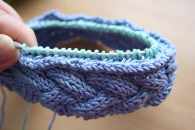 Toista kerroksia 4-11, kunnes palmikkonauhan pituus riittää lapsen pään ympäri. Päätä silmukat ja ompele nauha renkaaksi ("pannaksi") tai käytä kolmen puikon päättelyä, jolla sauman saa todella siistiksi. Neulo silloin palmikkokaitaleen päät yhteen nurjalta puolelta oikeat puolet vastakkain oikein neuloen.