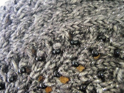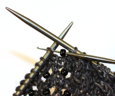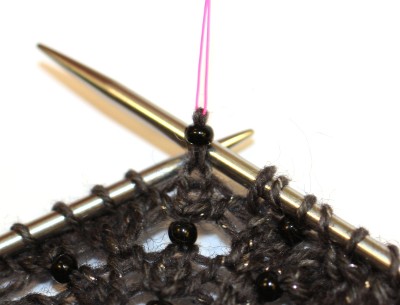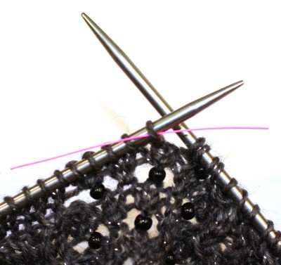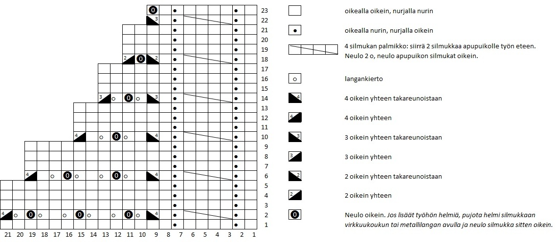 2. krs: *1 o, 1 n, siirrä 2 s apupuikoille työn eteen, neulo 2 o, neulo apupuikon silmukat o, 1 n, 1 o, neulo 4 s takareunoistaan yhteen, lk, lisää helmi ja neulo o, lk, 1 o, lk, lisää helmi ja neulo o, lk, 1 o, lk, lisää helmi ja neulo o, lk, 4 o yhteen (normaalisti etureunoistaan)*.