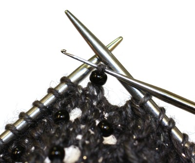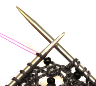 | 1 c. Vedä silmukka vaijerin avulla puikolle ja poista vaijeri. Neulo silmukka tavalliseen tapaan helmen yläpuolelta. |