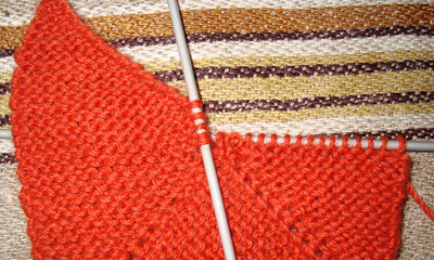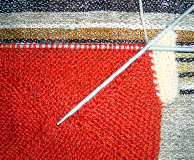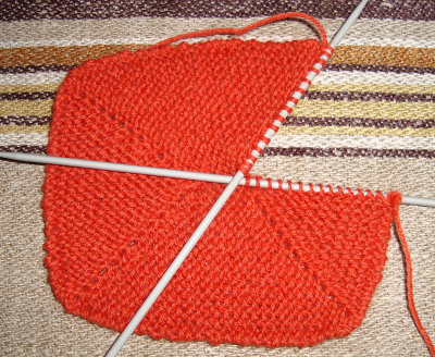 Reunus on nyt saavuttanut lopullisen leveytensä. Tästä eteenpäin sen toisessa reunassa kavennetaan ja toisessa levennetään ja silmukkamäärä pysyy samana.