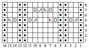 1. krs (op): Nosta 1 s neulomatta, neulo 16 o, tee ylivetokavennus, neulo 1 o ja käännä työ.