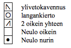 1. krs: Neulo 1. puikko: 13 o, 2 o yht, 1 o 2. puikko: 1 o, ylivetokavennus, 13 o 3. puikko: 13 o, 2 o yht, 1 o 4. puikko: 1 o, ylivetokavennus, 13 o. 2. krs: Neulo kaikki silmukat oikein.