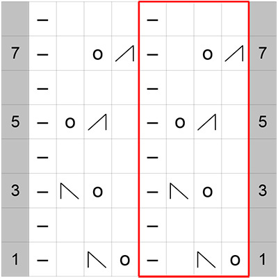 Pitsineuleen langankierrot ja kavennukset tehdään parittomilla kerroksilla. Parilliset kerrokset neulotaan toistamalla 3 o 1 n.