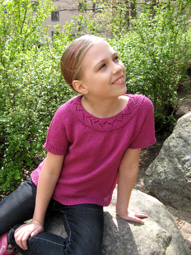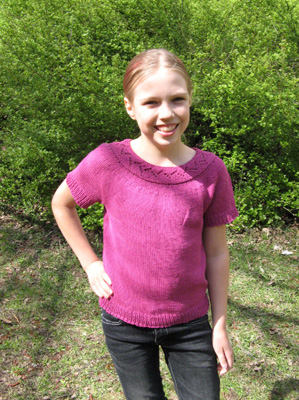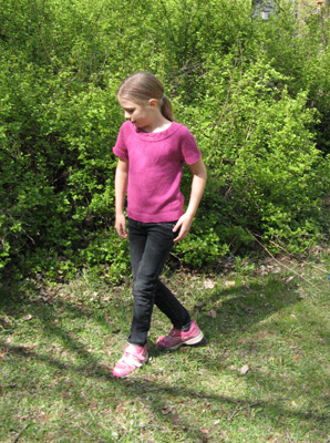 Lapsen kesäpusero on neulottu ohuesta puuvillalangasta. Saumattomaan puseroon neulotaan ensin lyhennetyillä kerroksilla muotoiltu pitsikuvioinen kaulus, josta poimitaan silmukat ja jatketaan työtä helmaan. Ylhäältä alas neulottua puseroa on helppo sovittaa työn edetessä ja soveltaa esimerkiksi helman ja hihojen pituutta tarpeen mukaan.