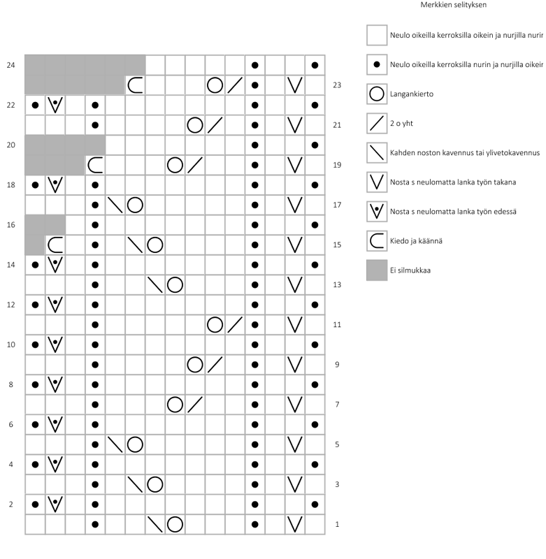 Luo 15 s. Neulo 1 krs n. Aloita sitten kauluksen pintaneule ruutupiirroksen mukaan. *Neulo kerrokset 1-12 kerran ja kerrokset 13-24 kahdesti.* Toista *-* yhteensä 6 kertaa. Päätä s:t kerralla. Kaitaleen sisäreunan pituus on noin 48 cm. Ompele kauluskaitaleen päät yhteen siten, että kaulus muodostaa ympyrän.