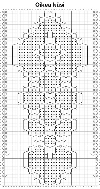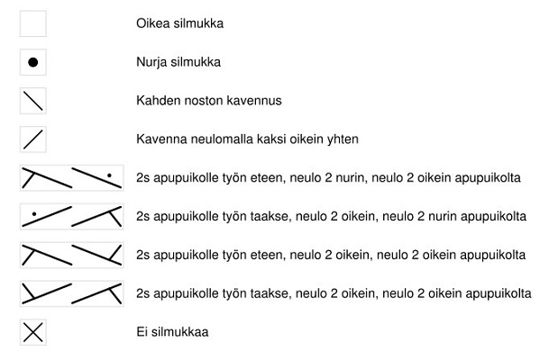 1. kerros: oikein 2. kerros: *knk, 2 o, okl, 1 o, vkl, 2 o, 2 o yht*, toista *_* kaksi kertaa, knk, 11 o, okl, 1 o, vkl, 11 o, 2 o yht, *knk, 2 o, okl, 1 o, vkl, 2 o, 2 o yht*, toista *_* kaksi kertaa. 3. kerros: oikein 4. kerros: *knk, 2 o, okl, 1 o, vkl, 2 o, 2 o yht*, toista *_* kaksi kertaa, knk, 11 o, okl, 1 o, vkl, 11 o, 2 o yht. Käännä työ ja neulo 27 o, käännä työ, knk, 11 o, okl, 1 o, vkl, 11 o, 2 o yht, *knk, 2 o, okl, 1 o, vkl, 2 o, 2 o yht*, toista *_* kaksi kertaa. 5. kerros: oikein 6. kerros: kuten 2. kerros 7. kerros: oikein 8. kerros: *knk, 2 o, okl, 1 o, vkl, 2 o, 2 o yht*, toista *_* kaksi kertaa, knk, 11 o, okl, 1 o, vkl, 11 o, 2 o yht. Käännä työ ja neulo 26 o, käännä työ, knk, 10 o, okl, 1 o, vkl, 10 o, 2 o yht. Käännä työ ja neulo 24 o, käännä työ, knk, 9 o, okl, 1 o, vkl, 9 o, 2 o yht, 2 o, *knk, 2 o, okl, 1 o, vkl, 2 o, 2 o yht*, toista *_* kaksi kertaa. 9. kerros: oikein 10. kerros: kuten 2. kerros 11. kerros: oikein