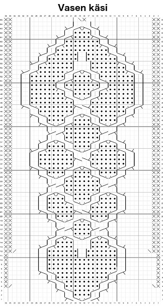 Kaavio neulotaan puikoilla 2 ja 3. Kaavioon on merkitty kavennukset (kaavion kerroksilla 4 ja 12), tällöin kavennetaan myös 1. ja 4. puikolla, kuten edellä. kaavion 12. kerroksen jälkeen työssä on yhteensä 65 silmukkaa.