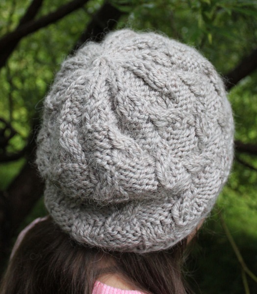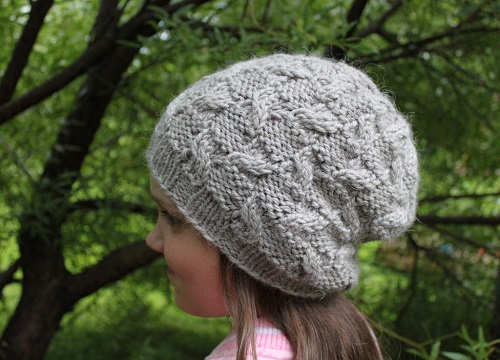 24 s ja 19 krs palmikkomallineuletta paksummilla puikoilla = 10 cm (mitattu pingotuksen jälkeen)
