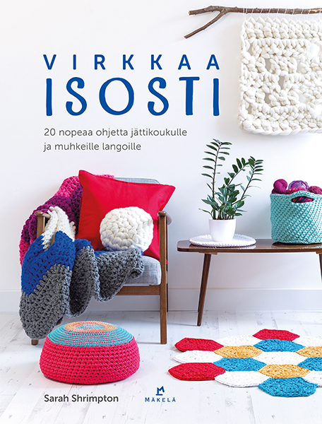 Sarah Shrimptonin Virkkaa isosti -kirjassa ei sipistellä, vaan virkataan vauhdikkaasti isolla koukulla ja paksulla langalla tai kuteella. Itse asiassa kirjassa neuvotaan, että materiaaliksi sopii myös vanhoista t-paidoista leikattu kude – miten mainio kierrätysvinkki! Jumbovirkkauksen ideana on virkata paksuista materiaaleista, joten myös silmukat ja virkkaamiseen tarvittava virkkuukoukku ovat isommat.