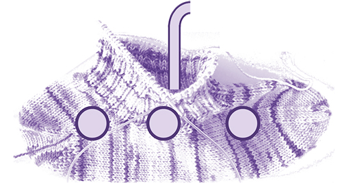 Jatka neulomista pyörönä. Kun neulot kieputukset seuraavalla kerroksella oikein, ne jäävät silmukoiksi lisäpyörölle. Neulottavana nyt (32+32) - (36+36) silmukkaa. Jaa silmukat tasan puikoille niin että viimeksi luodut 14 - 18 silmukkaa ovat jalan päällä keskellä, 9 silmukkaa Suban pohjan reunoista kääntyy jalan päälle. Kerroksen aloituskohta on Suban oikeassa sivussa.