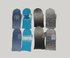 Lanka Mallilapasissa on käytetty Pirtin kehräämön hahtuvaa ja Piikun hahtuvalankaa (huomaa, että Pirtin kehräämön hahtuvalanka on eri asia). Hahtuvaa menee lapasiin noin 90 – 100 – 110 – 120 – 130 g. Neuletiheys Sileää oikeaa kahdella säikeellä neulottuna (ennen huovutusta) 19-20 s ja 31 krs = 10 cm Puikot 4 mm sukkapuikot tai käsialan mukaan Koko XS – S – M – L – XL OhjeLapanenNeulo koko ajan kahdella säikeellä. Luo puikoille 44 – 48 – 52 – 56 – 60 s. Jaa silmukat puikoille ja vaihda ensimmäisen ja viimeisen silmukan paikkaa. Neulo ensimmäinen kerros nurin. Neulo oikeaa 14 – 15 – 16 – 17 – 18 senttiä. Neulo peukaloa varten eri värisellä langalla toisen puikon 7 – 8 – 9 – 10 – 11 viimeistä silmukkaa (vasemman käden lapanen) tai kolmannen puikon 7 – 8 – 9 – 10 – 11 ensimmäistä silmukkaa (oikean käden lapanen). Neulo oikeaa 13 – 14 – 15 – 16 – 17 senttiä. KärkikavennuksetKavennukset tulevat ensimmäisen ja kolmannen puikon alkuun sekä toisen ja neljännen puikon loppuun. Neulo ensimmäisen puikon alussa 1 s ja käännä kaksi seuraavaa silmukkaa puikoilla toisin päin (etureuna takareunaksi, joudut nostamaan silmukat). Neulo käännetyt silmukat takareunoistaan yhteen ja neulo puikon loput silmukat oikein. Neulo toisen puikon silmukat oikein, kunnes jäljellä on kolme silmukkaa. Neulo kaksi oikein yhteen ja neulo viimeinen silmukka oikein. Tee kolmannen puikon alussa samanlainen kavennus kuin ensimmäisen puikon alussa ja neljännen puikon lopussa samanlainen kavennus kuin toisen puikon lopussa. Tee kavennukset joka kerroksella ohjeen mukaan, kunnes jäljellä on 8 s. Neulo ensimmäinen silmukka ja vedä muut silmukat sen yli. Päättele lanka. PeukaloPura eri värinen lanka ja poimi siltä silmukat. Poimi alapuolelta 7 – 8 – 9 – 10 – 11 s ja yläpuolelta 8 – 9 – 10 – 11 – 12 s. Jaa silmukat kolmelle puikolle ja neulo oikeaa 6,5 – 7 – 7,5 – 8 – 9 senttiä. Päätä silmukat neulomalla joka kerroksella puikon kaksi viimeistä silmukkaa yhteen. Päättele silmukat kun puikoilla on 6 – 8 – 7 – 6 – 8 s. Neulo ensimmäinen silmukka ja vedä loput silmukat sen yli. Neulo toinen lapanen samalla tavalla, mutta huomio peukalon paikka. ViimeistelyPäättele langanpätkät. Harsi lapasten sisälle muovia, etteivät ne huovu kiinni sisältä. Pese lapaset 40 asteessa. Laita koneeseen lisäksi hyvin vähän muuta pyykkiä, esimerkiksi pari pyyhettä. Käytä pesuaineena mielellään mäntysuopaa tai muuta pesuainetta, joka säilyttää villassa sen rasvan, mutta voit käyttää myös tavallista pesuainetta. Samassa koneellisessa voi pestä useita lapasia, ne eivät huovu toisiinsa kiinni. Muotoile lapaset kosteana. Jos lapaset ovat liian isot, ne voi pestä uudestaan. Liian pieniä lapasia voi muotoilla ja venyttää kosteana ja mielellään antaa kuivua muotoonsa. VinkkejäHuopuminen ja kutistuminen riippuvat hyvin monista asioista. Jos et ole varma koosta ja huopumisesta, voit tehdä mallitilkun ja siten mitata huopumista ja kutistumista. Löyhä neule kutistuu enemmän kuin tiukka, joten ohuesta hahtuvasta neulottaessa kannattaa tehdä mallitilkku ja kokeilla huopumista ensin. Ohjeen mukaan kutistumisvaraa on leveydessä noin 20% ja pituudessa noin 30%. Kahdella säikeellä neulottaessa ota toinen säie kiekon sisältä ja toinen ulkoa. Hahtuvalanka katkeaa helposti, varsinkin alussa. Jos ja kun lanka katkeaa, niin laita langanpäät muutaman sentin kohdalta päällekkäin ja jatka neulomista. Huovutettaessa langat huopuvat yhteen, joten katkeilut eivät haittaa. Kun lankaan tottuu, katkeilukin vähenee. Värjätty hahtuva saattaa päästää väriä, mutta ei värjää pesussa. Minulla värjääntyivät sormetkin neuloessa, mutta turkooseissa lapasissa valkoinen raita oli valkoinen huovutuksen jälkeenkin. Helppo tapa tehdä yksinkertaiset ja kauniit lapaset on käyttää kirjavaa väriävaihtavaa hahtuvaa. Kokeile kirjavaa lankaa yhdessä valkoisen kanssa siten, että toinen säie on valkoista ja toinen kirjavaa. Pinnasta tulee meleerattua ja voit hyödyntää kiekkojen loppuja. Käännä lapasten nurja puoli oikeaksi puoleksi ja päättele langan päät sisäpuolelle. Näin saat taas eri näköisen pinnan. Tee itse kirjava sekoitus. Se onnistuu kahdella yksivärisellä hahtuvalla. Neulo ensin toisella värillä kahdella säikeellä. Vaihda sitten toinen säie toiseksi väriksi eli nyt neulot kahdella eri värisellä säikeellä. Neulo lopuksi vielä toisella värillä kahdella säikeellä. Tällä tavoin voit tehdä esimerkiksi raidalliset lapaset. Voit ommella lapasiin kuvioita ennen huopumista huopuvalla langalla. Ota huomioon, että neulepinta kutistuu vähemmän kuin pelkkä lanka, joten tee kuviosta löysä ja pistoista lyhyitä. Voit ommella kuviota lapasiin huopumattomilla langoilla huovuttamisen jälkeen. Kirjoneule ei huovutettuun työhön sovi. Tein koetilkun ja kirjoneule