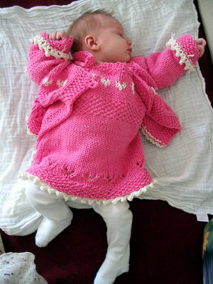 Lanka ja langan menekki Novita Samos, pinkki: takkiin 100 g, mekkoon 100 g Neuletiheys 23 s ja 30 krs sileää neuletta / 10 cm Puikot 40 tai 60 cm pyöröpuikko 4,5 mm tai käsialan mukaan Muut tarvikkeet Kolme nappia (yksi takkia ja kaksi mekkoa varten) Koot Takki Vartalonympärys noin 54 cm Mekko kun olkain on pisimmillään, pituus noin 36 cm (nirkkoreunan