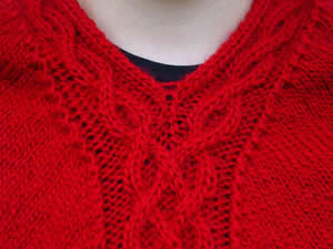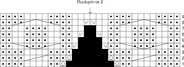 Kaksinkertainen kavennus neulotaan kaula-aukon vasemmalla puolella seuraavasti: nosta 1 s neulomatta, neulo 2 s oikein yhteen, vedä nostettu silmukka neulottujen yli (aiemmin vasemmassa reunassa kavennettiin takareunoista 2 o yhteen). Kaula-aukon oikealla puolella kavennus on jatkossa 3 o yhteen (aiemmin 2 o yhteen). Ruutupiirroksen 2 jälkeen työ jatkuu tasoneuleena. Kun olet neulonut ruutupiirroksen kerroksen 9, kerroksen aloituskohdaksi vaihtuu seuraavalla kerroksella kaula-aukon reuna. Jatkossa kaikki kavennukset ja palmikonkierrot tehdään edelleen työn oikealla puolella. Kerroksen aloituskohdan siirtymisen takia vasemmalle puolelle kaula-aukkoa tulee yksi ylimääräinen kerros jota ei oteta huomioon ruutupiirroksessa. Neulo tämän "ylimääräisen" kerroksen oikeat silmukat oikein ja nurjat nurin, eli ruutupiirroksen 2 kerros 9 kerrataan nuoleen saakka. Jaa työ nuolen osoittamasta kohdasta keskeltä punoskuviota: käännä työ nurja puoli itseesi päin ja aloita ruutupiirros 3b. Kuvio jakautuu kaulukseksi molemmille puolelle kaula-aukkoa. Neulo kauluskuviota ruutupiirroksen 3 mukaan: Kaula-aukon ja hupun reunasilmukat neulotaan aina oikein. Ruutupiirros 3a kuvaa kaula-aukon oikeaa reunaa, 3b vasenta. Huppu