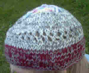 Rag stripe –pipo reikäraidalla Neulo reikäraita oikean puolen kerroksella: 1 o, lk, 2 s takareunasta o yht, toista näin koko krs. Neulo nurja krs ja toista reikäraita. Jatka sileää oikeaa, kunnes työn pituus on 11 cm. Aloita kavennukset: neulo 13 o, 2 yht, toista koko krs. Neulo seuraavalla krs:lla 12 o, 2 yht, toista koko krs. Kavenna samoissa kohdissa joka krs, kunnes silmukoita on jäljellä 5. Vedä lanka läpi ja päättele. Ompele takasauma.