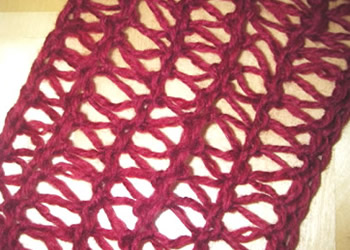 Koko Huivin pituus 150 cm, leveys 14 cm Huivi neulotaan pitkittäin, joten huivin pituus määräytyy silmukkamäärän mukaan. Ohjeen 105 silmukalla ja annetulla neuletiheydellä huivista tulee noin 150 cm pitkä. Jos vaihdat langan, tee mallitilkku, jotta huivin pituus on juuri haluamasi. OhjeLuo 105 silmukkaa löyhästi kahdelle puikolle jotta aloitusreunasta tulee löyhä. Neulo 1 kerros oikein ja aloita seuraavalla kerroksella mallineule: 1. krs: 1 s oikein, *lk, lk, 1 s oikein*. Toista *-* kerroksen loppuun, kunnes jäljellä on vain 1 silmukka. Tee vielä 2 langankiertoa peräkkäin ja neulo viimeinen silmukka oikein. 2. krs: neulo koko kerros oikein siten, että päästät langankierrot puikolta. Silmukkamäärä säilyy ennallaan ja langankierrot muodostavat pitkät silmukat. 3. krs: oikein. Toista kolmea kerrosta vielä 4 kertaa ja neulo vielä 1 kerros oikein. Päätä silmukat löyhästi, jotta myös lopetusreunasta tulee löyhä. Päättele langanpäät. Vinkki: Jos haluat vaihtelua, voit raidoittaa kerrokset vaihtamalla väriä aina 3 kerroksen välein. Lanka pitää silloin kuitenkin katkaista, koska kerrosvälit ovat pitkät ja huivin päistä tulisi muuten epäsiistit. Lisäksi mallissa on pariton kerrosmäärä, mikä estää langan vaihtamisen samassa reunassa.