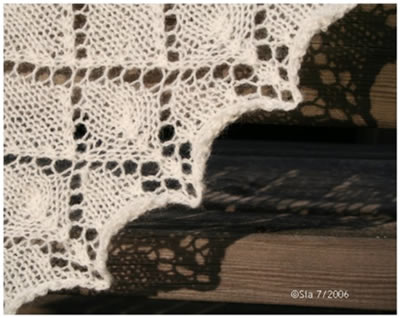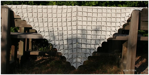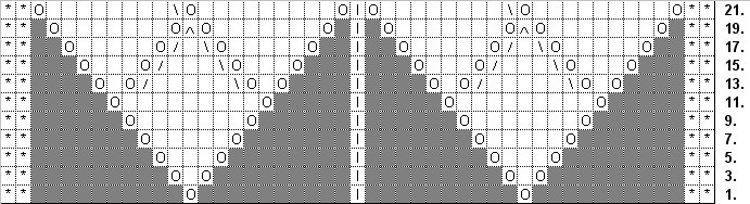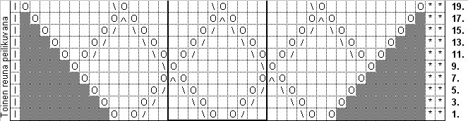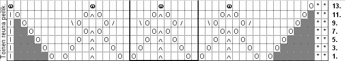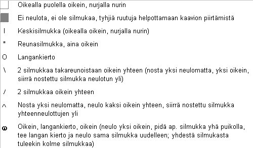 Kaavioiden seuraaminen ViimeistelyPujottele pitkä puuvillalanka huivin reunojen reikärivin ja "hulpioreunan" kuvioiden kärjissä olevien reikien läpi. Jätä puuvillalanka niin suureksi renkaaksi, että se varmasti riittää pingotetun huivin ympäri. Kostuta/liota/tee hoitoainekäsittely tarvittaessa materiaalin mukaan ja kuivaa hyvin rullaamalla huivi pyyhkeen sisään. Pingota huivi nuppineulojen avulla esim. patjalle tai isolle matolle: kiinnitä nuppineulat hyvin tukevasti huivin teräviin kärkiin (apulanka nuppineulan ulkopuolelle), vedä apulanka kireälle kolmion alimmasta kärjestä ja muotoile huivi oikean malliseksi. Kiinnitä nuppineuloilla sieltä täältä, jotta muoto varmasti pysyy oikeana. Anna kuivua hyvin. Kun huivi on kuiva, poista neulat (viimeistä myöden) ja päättele langanpäät. KaaviotKaaviossa toistettava alue on rajattu paksulla viivalla. Kaavio1