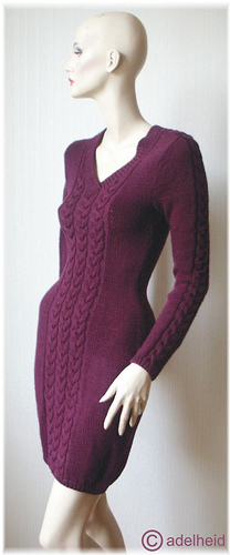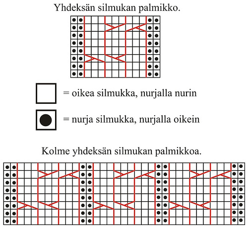 Kun takakpl:n pituus on 70 cm, päättele kädentietä varten kummastakin reunasta joka 2. krs ensin 1 x 3 s ja sen jälkeen 2 x 1 s. Jatka sileää neuletta lopuilla 61 s:lla. Kun takakpl:n korkeus on 90 cm, päättele kaikki silmukat kerralla. EtukappaleLuo 87 s ja neulo 1 o 1 n -joustinneuletta 3,5 mm puikoilla 2 cm. Vaihda työhön 4 mm puikot ja neulo sileää neuletta. Neulo kappaleen keskelle kolme yhdeksän silmukan palmikkoa kaavion mukaan. Kun työn korkeus on 34 cm, kavenna kummassakin reunassa joka 4. krs yhteensä 6 x 1 s. Jatka kaventamista joka 6. krs palmikkoneuleen kummaltakin puolelta yhteensä 4 x 1 s. Neulo 67 s:lla, kunnes etukpl:n korkeus on 58 cm. Aloita lisäykset: lisää joka 4. krs 4 x 1 s palmikkoneuleen kummallakin puolella. Jatka 75 s:lla, kunnes etukpl:n korkeus on 70 cm. Päättele sen jälkeen kädentietä varten kummassakin reunassa joka 2. krs ensin 1 x 3 s, sitten 1 x 2 s ja lopuksi 2 x 1 s. Päättele seuraavalla krs:lla työn keskimmäinen silmukka ja jatkossa pääntietä varten joka 2. krs yhteensä 13 x 1 s kummastakin reunasta, kunnes kummallakin olkapäällä on 18 s. Jatka kummankin olkapään neulomista, kunnes etukpl:n korkeus on 90 cm ja päättele kaikki silmukat kerralla. Oikea hihaLuo 43 s ja neulo 1 o 1 n -joustinneuletta 3,5 mm puikoilla 2 cm. Jatka sen jälkeen jälkeen 4 mm puikoilla sileää neuletta ja neulo kappaleen keskelle yksi yhdeksän silmukan palmikko kaavion mukaan. Kun hihan pituus on 10 cm, lisää kummassakin reunassa joka 12. krs 5 x 1 s. Jatka 53 s:lla, kunnes hihan pituus on 43 cm. Lisää vielä kummassakin reunassa joka 2. krs 5 x 1 s. Kun hihan pituus on 46 cm, päätä joka 2. krs oikeassa reunassa ensin 1 x 3 s ja sitten 2 x 1 s ja vasemmasta reunassa ensin 1 x 3 s, sitten 1 x 2 s ja lopuksi 2 x 1 s. Jatka vielä kaventamista vasemmassa reunassa joka 4. krs 2 x 1 s, minkä jälkeen kavenna molemmissa reunoissa 3 x 1 s. Jatka kaventamista molemmissa reunoissa joka 2. krs ensin 2 x 1 s, sitten 2 x 2 s, sen jälkeen 2 x 3 s ja lopuksi 1 x 2 s. Neulo vielä palmikkoa lopuilla 15 s:lla, kunnes hihan pituus on 72 cm. Päättele loput silmukat kerralla. Vasen hihaNeulo oikean hihan peilikuvaksi. ViimeistelyPingota ja höyrytä kappaleet kevyesti nurjalta puolelta. Ompele etu- ja takakappaleen sekä hihojen sivusaumat. Kiinnitä hihat mekkoon niin, että hihojen palmikko jatkuu mekon olkapäille.