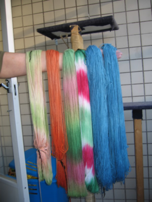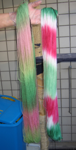 Kuvan langat on värjätty samalla tekniikalla ja samoilla väreillä. Kuvan vasemmanpuoleinen lanka oli alunperin luonnonvalkoista ja oikeanpuoleinen kirkkaanvalkoista.