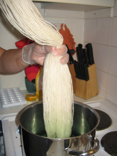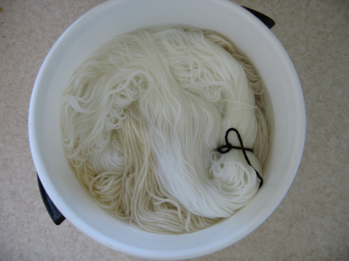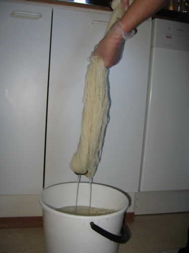 Aloita värjääminen laittamalla vyyhdit etikka-vesiseokseen likoamaan. Seokseen tulee kolmasosa etikkaa ja loput vettä. Anna vyyhtien liota niin kauan, kunnes lanka on täysin kastunut.