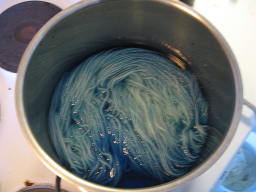 Kuumenna kattilassa vettä. Vesi ei saa kiehua. Sekoita haluamaasi elintarvikeväriä tai -värejä veteen. Upota lanka veteen, niin se imee vedestä värin itseensä. Kuvassa on luonnonvalkoinen lanka upotettuna siniseen väriseokseen.