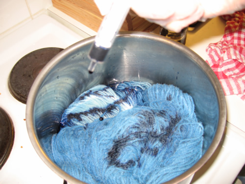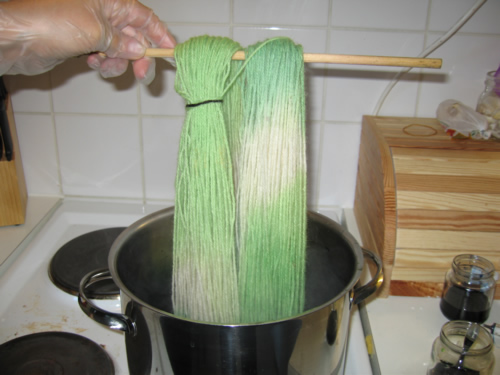 Vedestä tulee kirkasta, kun kaikki väri on imeytynyt siitä lankaan. Mikäli haluat vaihtaa väriä, voit käyttää jatkuvasti samaa vettä. Toista toimenpidettä niin kauan kuin haluat ja kunnes lanka on haluamasi väristä. Sekoita vyyhtiä kepillä saadaksesi värin tarttumaan kaikkialle.