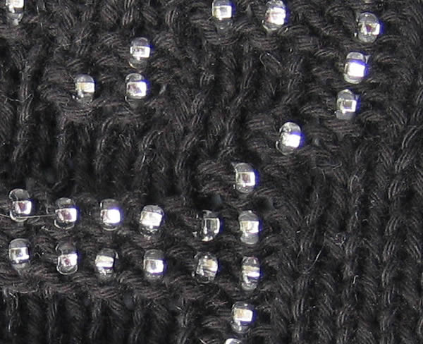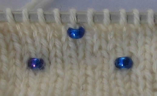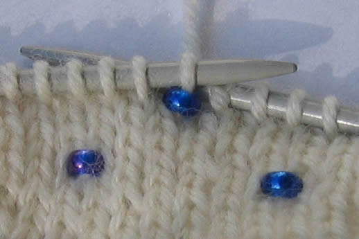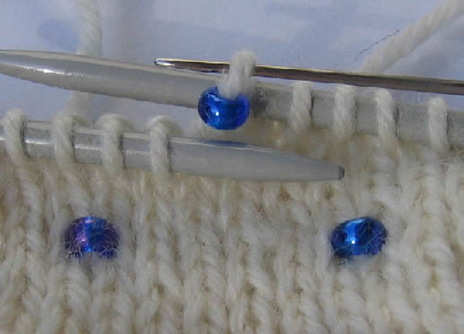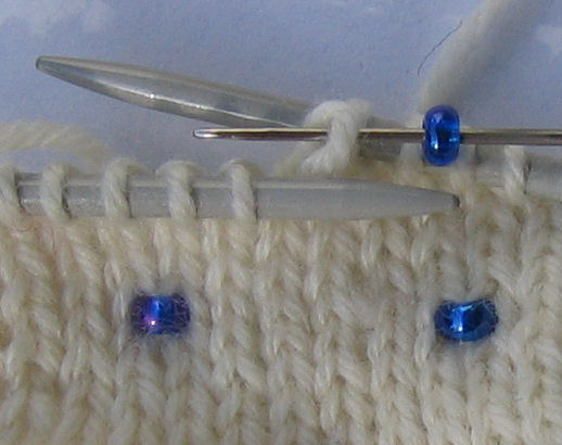 Helmiä neulottuna kahden nurjan silmukan väliseen lankalenkkiin. Virkkuukoukku apunaJos et halua pujottaa helmiä lankaan, voit pujottaa helmet pienellä virkkuukoukulla neulottavaan silmukkaan työn edetessä kuvasarjan mukaisesti. Virkkuukoukkua käyttäessäsi sinun ei tarvitse siirrellä helmiä langalla eteenpäin ja säästät aikaa siinäkin, ettei sinun tarvitse pujottaa helmiä lankaan ennen työn aloittamista. Toisaalta helmen lisääminen virkkuukoukulla on melko hidasta. Kun vedät helmen virkkuukoukulla silmukkaan, se sijoittuu keskelle ja näkyy sekä oikealle että nurjalle puolelle. Tämä tekniikka sopii hyvin erilaisiin pitsineuleisiin korostamaan kuvioita, se toimii hyvin myös paksumpien ja pörröisten mohairlankojen kanssa ja sopii myös virkkaukseen. Virkkuukoukun pitää vain olla tarpeeksi pieni, jotta se menee helmen läpi. Koska helmet eivät yleensä ole ihan tasakokoisia, mukana saattaa olla pienempiäkin helmiä, joiden läpi virkkuukoukku ei mahdu. Nämä kannattaa ottaa erilleen ja käyttää myöhemmin johonkin muuhun. Tee näin