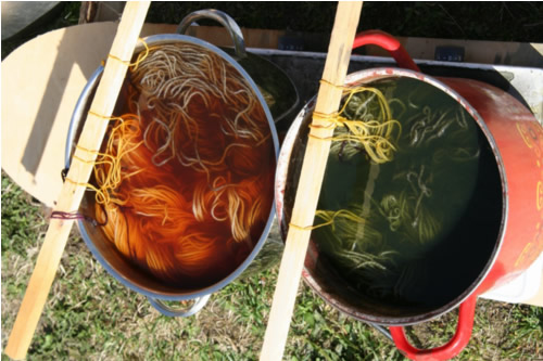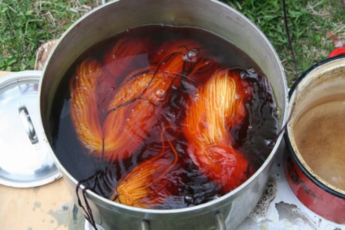 Aloitetaan helposta ohjeesta, jota voi kätevästi kokeilla ihan kotioloissakin. Yleensä on kätevintä, jos voit värjätä mökillä ym. varsinkin, jos lähellä on mahdollisesti järvi tai joki, josta saat runsaasti ja helposti vettä. Ulkona värjääminen on myös mukavampaa kuin sisällä värjääminen, jos väriaineet tuoksuvat pahalle. Erityisesti sienillä on sellainen ominaisuus. Sipulinkuorilla värjääminenVyyhteä ensin langat. Älä tee liian suuria vyyhtejä, esim. 50 g tai vähemmän on hyvä koko. Kiinnitä vyyhdit hyvin pasmalangoin, jotta vyyhdit eivät sotkeennu liemissä tai huuhteluvaiheessa. Älä kiristä liian tiukalle, jotta väri pääsee kiinnityslangan allekin. Laita myös lanka sitä varten, että saat vyyhdin roikkumaan keppiin kattilan reunalle.