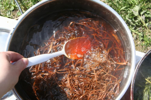Pajunkuori- ja nokkosväriliemet Laita sipulinkuoret kattilaan kiehumaan (kohtuullinen määrä riittää, sipulinkuorista tulee väriä runsaasti) ja keitä niin kauan, että liemi on voimakkaan väristä, puoli tuntia riittää. Siivilöi liemi. Jos sinulla on aikaa, anna liemen jäähtyä itsekseen ja lisää langat jäähtyneeseen liemeen.