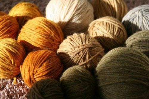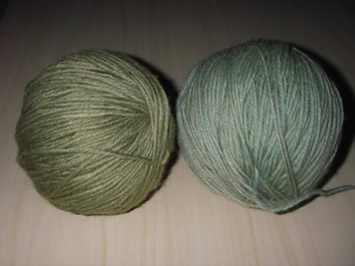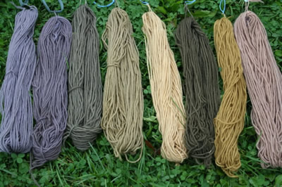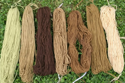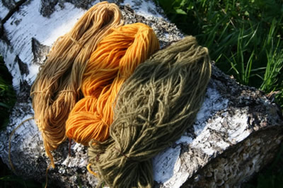 Vasemmalta: Pajunkuorilla, sipulinkuorilla ja nokkosella värjättyjä lankoja; Lupiininkukilla värjättyjä lankoja