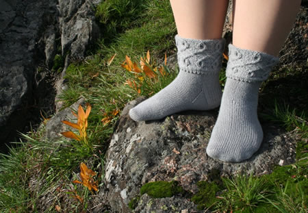 Aino-sukilla kelpaa nykyneidonkin astella, sillä ne on neulottu pehmeästä silkkisekoitelangasta. Sukkien taitteessa on korea punoskuvio, joka pitää sukan varren mukavasti jalassa, vaikka vastaan astelisi sulho, joka muuten saisi sukat pyörimään. Lanka ja langan menekki Regia Silk (55 % villaa, 20 % silkkiä ja 25 % polyamidia; 50 g/200 m), 100 (150) g
