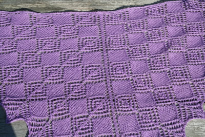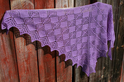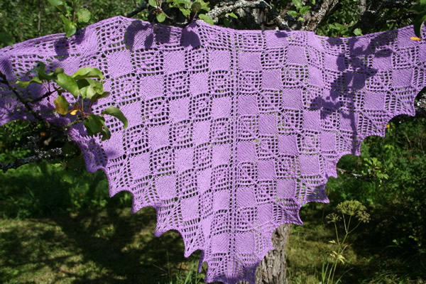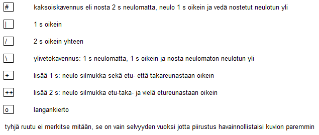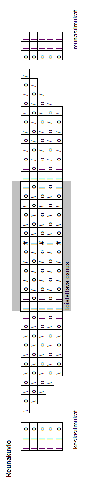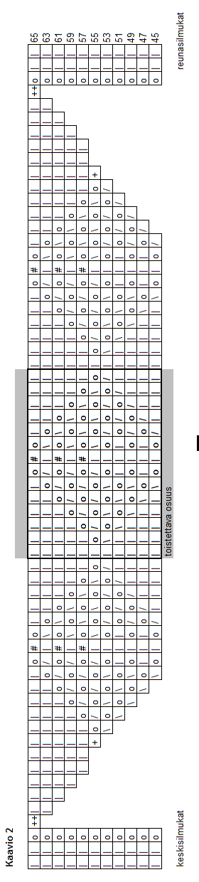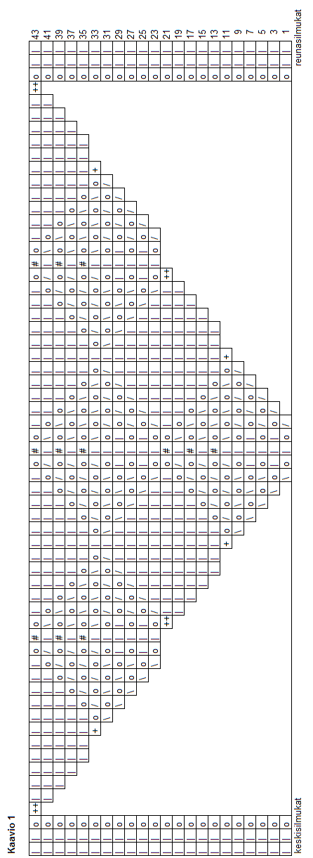 Aloita kuvio sen jälkeen kaavion 1 kerrokselta 1. Kaaviossa on vain oikeat kerrokset. Neulo nurjalla aina 2 reunimmaista silmukkaa oikein, muuten nurjalla kaikki silmukat nurin. Kuvio muodostaa pitsiruutuja sekä sileitä ruutuja. Kun pitsiruutu alkaa, silmukat lisääntyvät reunassa 2:lla ja sileän ruudun alkaessa 1:llä. Kun olet neulonut kaavion 1, jatka kaaviosta 2 ja toista kerroksia 45-66 (tässä huivissa on 10 kokonaista ruutua niskasta laskien). Kun olet neulonut viimeiseksi 54. kerroksen, siirry neulomaan reunuskaaviota. Neulo se kerran ja päättele löyhästi. Olen itse käyttänyt huiveissa Interweave Knits -lehdestä oppimaani tapaa, jossa päättely tehdään nurjalla puolella. Aloita päättely siinä näin: Neulo 2 s oikein, *siirrä neulotut silmukat vasemmalle puikolle ja neulo silmukat takareunoistaan yhteen, 1 s oikein*. Toista * - *. ViimeistelyPäättele langanpäät, kastele huivi ja pingota kuivumaan.