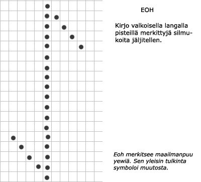 Luin Isosta Tammesta joitakin kuukausia sitten ja koin aiheen kiehtovaksi. Kalevala-Ullaa varten päätin yhdistää pienen projektin kauniille langalle ja rakkauteni pohjoista maailmanpuuta kohtaan. Iso Tammi-kämmekkäät syntyivät. Oikeaan kämmekkääseen kirjailtu riimu on Eoh, joka symboloi maailmanpuuna useissa kulttuureissa pidettyä yewiä. Toinen Eohiin yhdistettävä puu on tammi, joten se oli luonteva valinta kuvioksi tähän työhön. Eoh – kuten yew – on muutoksen ja jatkuvan uusiutumisen symboli. Kämmekkäät neulotaan leveyssuunnassa edestakaisin ja lopuksi aloitus- ja päättelyreunat ommellaan yhteen. Neuloessa suositellaan kuuntelemaan Värttinää, esim. Aitara-levyltä löytyvää kappaletta Tammi. Lanka ja langan menekki Austermannin Bambou Soft, (65 % superwash merino, 35 % bambu; 50 g / 100 m), 50 g tummaa punaruskeaa (016) Kirjailuun mitä tahansa valkoista villalankaa, jonka paksuus vastaa työssä käytettyä, reilu metri riittää loistavasti (itse käytin kaksinkertaista Hjerten sukkalankaa) 50 grammaa lankaa riittää normaalikokoiseen käteen ja käsivarteen. Omat käteni ovat isot, joten lankaa kului hieman enemmän, ehkä 60 g. Neuletiheys 19 s ja 25 krs sileää neuletta = 10 cm Puikot 5 mm tai käsialan mukaan Muut tarvikkeet kanavaneula Koko käden ympärys rystysten kohdalta 20 cm OhjeEnnen kuin aloitatNeulo kaksi palmikoilla koristeltua aina oikein -neulottua kämmekästä toistensa peilikuviksi. Lisäksi oikean kämmekkään kädenselässä on sileää neulosta kirjailua varten. Jos haluat kummastakin kämmekkäästä samanlaisen, katso lisäohjeita lopusta. Silmukkamerkkien tarkoitus on helpottaa seuraamaan, missä palmikkokuvion raja kulloinkin kulkee. Oikeaa kämmekästä tehdessä silmukkamerkeillä rajataan alue, jolla tehdään sileää neulosta. Koska palmikkokuvio alkaa vasta toisella kerroksella, perinteisestä nurjasta puolesta tulee työn oikea puoli. Tämän vuoksi työn ensimmäinen kerros on nurjan puolen kerros. Kun ohjeessa puhutaan oikeasta puolesta, sillä tarkoitetaan sitä puolta työstä, jolla palmikonkierrot tehdään. Palmikkokuvion kääntöä oli hankala pukea sanoiksi. Kyseessä on kahden silmukan levyinen palmikko, jossa kierretään yhtä silmukkaa. Voit käyttää kierron tekemiseen apupuikkoa, mutta ristiin neulominen on nopeampaa. Muista kuitenkin neuloa molemmat silmukat etureunastaan, jotta palmikko kiertyy oikein. Pikaohje kaavionlukutaitoiselleJos et pidä sanamuotoisista ohjeista, silmäile ohjetta sen verran, että tiedät, kumpi palmikko-osio (A–B vai A–C) tehdään työn alla olevassa kämmekkäässä ensin (eli oikeaan reunaan, kun työn oikea puoli on sinua kohti), ja neulo palmikko-osioiden väliin 22 s aina oikeaa. Toista kaavion kerroksia 1–4 kerrokselle 42 [50] asti, jonka jälkeen neulo kaavion kerrokset 5–7 kerran ja päättele. Oikean kädenselän sileän neuloksen voit toteuttaa haluamasi kokoisena. Kun sen yläreuna kulkee yhden silmukan päässä kädensuun reunan palmikkokuviosta (A–B), se asettuu sievästi kädenselälle. Vasen kämmekäsLuo 38 s. 1. krs (NP): neulo kaikki silmukat oikein Toista kerroksia 2–5 yhteensä 9 [11] kertaa 42. [50.] krs (OP): neulo kaavion 5. krs A–C, neulo 22 s oikein, neulo kaavion 5. krs A–B Päättele kaikki silmukat. Oikea kämmekäsNeulo oikea kämmekäs vasemman peilikuvaksi ja tee samalla kädenselälle sileänä neuleena pohja kirjottua kuviota varten kerroksilla 8–29. Luo 38 s. 1. krs: neulo kaikki silmukat oikein Toista kerroksia 8–9 yhteensä 10 kertaa Toista kerros 9 42. [50.] krs (OP): neulo kaavion 5. krs A–B, neulo 22 s oikein, neulo kaavion 5. krs A–C Päättele kaikki silmukat. Kaaviot
