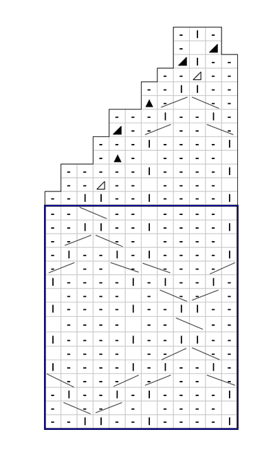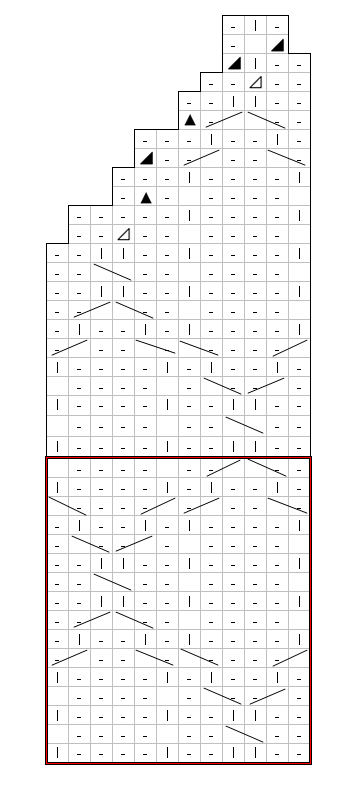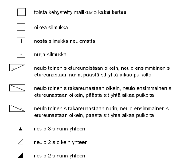 OhjeLuo 84 (96) silmukkaa ja yhdistä ne pyöröneuleeksi pyöröpuikolle. Laita silmukkamerkki kerroksen vaihtumiskohtaan. Neulo pyöröneuleena kaavion mukaisesti. Huomaa, että lapsen ja naisen pipoa varten on piirretty omat kaaviot. Neulo naisen pipoa varten punaisella kehystetty osa kahdesti ja jatka sitten kaavion loppuun. Lapsen pipossa kahdesti toistettava osio on merkitty sinisellä. Kaavion lopussa puikoilla on 1 o, 2 n -joustinneuletta. Kavenna nurjissa raidoissa yksi silmukka pois (*1 o, 2 n yhteen* koko kerroksen ajan). Katkaise lanka, vedä se jäljellä olevien silmukoiden läpi ja kiristä. Päättele langanpäät. KaaviotAikuisen koko