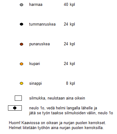 RannekeLuo 22 silmukkaa eri langalle (nämä silmukat puretaan lopuksi). Neulo 5 cm aina oikeaa. Aloita helmikuvio kaavion mukaan, kun olet neulonut parittoman määrän kerroksia varsinaisella langalla. Huomaa, että kaavion ensimmäinen kuvio neulotaan oikein ja helmet liitetään neuleeseen aina nurjilla kerroksilla. Neulo helmikuvion jälkeen aina oikeaa, kunnes ranneke on riittävän pitkä. Lopeta nurjan puolen kerroksen jälkeen. Mittaa lankaa noin 3 kertaa neuleen leveyden verran ja katkaise lanka. Pura aloitusreunan toinen lanka ja ota silmukat puikolle. Silmukoi aloitusreuna ja lopetusreuna yhteen (voit myös käyttää kolmen puikon päättelyä (Ulla 03/05), mutta sillä tulee paksumpi sauma). Päättele langanpäät. Kaavio