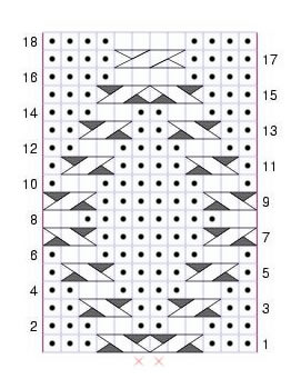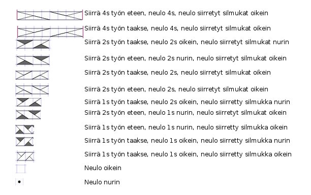 Palmikkopaneli muodostuu Koska panelissa on 74 - 82 silmukkaa, lisää ensimmäisellä palmikkokerroksella palmikoiden A molempiin reunoihin yksi silmukka, palmikon B keskelle yksi ja palmikon C reunoihin yksi ja keskelle kaksi silmukkaa, yhteensä 10 s. Neulo lisättävät silmukat kaavion mukaan joko nurjina tai oikeina. Nämä silmukat on merkitty kaavion ensimmäiselle kerrokselle rasteilla. Älä tee lisäyksiä myöhemmin palmikoita toistettaessa, ainoastaan panelin alussa. Voit vaihtoehtoisesti tehdä lisäykset muulla symmetrisellä tavalla. Kaavioissa lisätyt silmukat ovat normaaleja silmukoita.