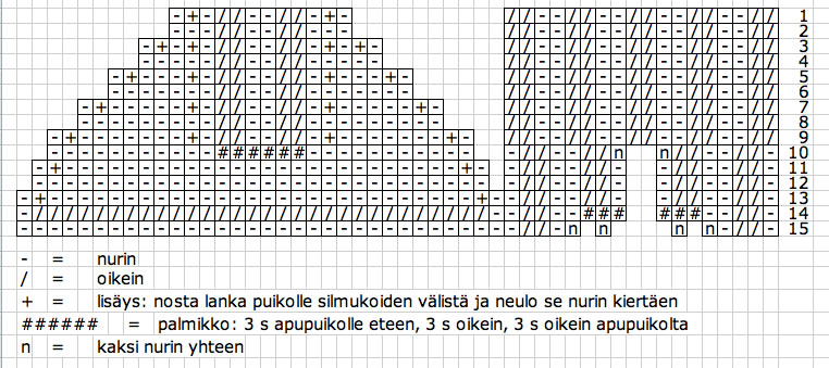Lanka ja langan menekki Kuvien kaulurit Yksivärinen: Rowan RYC Cashsoft Aran (57% merinovillaa, 3 % mikrokuitua, 10% kashmiria, 87 m / 50 g), 100 g ruskeanpunaista (005) Kaksivärinen: Debbie Bliss Cotton Angora (80% puuvillaa, 20% angoraa, 90 m / 50 g), 50 g sinivihreää (15507) ja 50 g vaaleanvihreää (15505) Neuletiheys 19 s ja 25 krs sileää neuletta = 10 cm Puikot Pyöröpuikot, 40-50 cm, 4 mm tai käsialan mukaan Koko Kaulaosan ympärysmitta n. 36 cm. Ympärysmitta on mitattu venyttämättä joustinta. Tämä koko sopii aikuiselle. Koon muuttaminen: Voit neuloa lasten kokoja vaihtamalla langan ohuempaan. Vastaavasti voit suurentaa kokoa tai neuloa aikuisten koon ohuemmasta langasta lisäämällä ylimääräisen mallikerran. Tällöin terälehtisarjoja tulee neljän sijasta viisi. Luo tällöin 112 silmukan sijasta 140 silmukkaa.