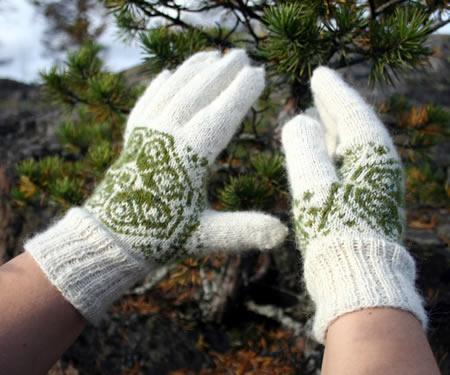 Neulo kämmenselkä kirjoneuletta kaavion 3 mukaan. Kun peukalokiila on valmis, neulo peukalokiilan silmukat seuraavalla kerroksella valkoisella ja jätä silmukat odottamaan langalle. Luo tilalle vihreällä kolme uutta silmukkaa. Puikoilla on jälleen yhteensä 65 s. Jatka neulomista kirjoneuleen loppuun. Neulo tarvittaessa valkoisella sileää, kunnes sormikas sovitettaessa ylettyy pikkusormen juureen. SormetJätä pikkusormen kohdalta silmukoita odottamaan langalle 12 s: 3. puikolta 6 s ja 4. puikolta 6 s. Luo jätettyjen silmukoiden tilalle 4 s; 3. ja 4. puikoille jää 12 s (10 s + 2 uutta luotua silmukkaa). Jatka sileää valkoisella 5 kerrosta. Siirrä 2. puikon 7 viimeistä silmukkaa, 3. ja 4. puikkojen kaikki silmukat ja 1. puikon 6 ensimmäistä silmukkaa odottamaan langalle. Aloita sormien neulominen etusormesta, niin säästyt yhdeltä langankatkaisulta. Jätä etusormea varten 1. puikon lopusta 10 s ja 2. puikon alusta 10 s, luo lisäksi 1. ja 2. puikon silmukoiden väliin 2 s lisää. Poimi nämä silmukat myöhemmin keskisormenkin silmukoiksi. Puikoilla on yhteensä 22 s. Jaa silmukat mahdollisimman tasan kolmelle puikolle. Neulo sormi sopivan mittaiseksi, ts. niin, että sormen kynsi peittyy melkein kokonaan. Kavenna jokaisen puikon alussa 2 s oikein yhteen, kunnes silmukoita on jäljellä 6. Katkaise lanka ja vedä se silmukoiden läpi. Poimi seuraavaksi keskisormea varten langalta kämmenen puolelta 8 silmukkaa, etusormea varten luodut 2 silmukkaa, sen jälkeen kämmenselän puolelta 9 silmukkaa ja luo langalla olevien silmukoiden väliin 2 uutta silmukkaa. Neulo keskisormi samoin kuin etusormi. Nimetöntä varten poimi keskisormea varten luodut 2 silmukkaa ja langalla olevat loput 20 silmukkaa, neulo nimetön samoin kuin keskisormi. Neulo pikkusormi neulotaan aikaisemmin odottamaan jätetyillä 12 silmukalla sekä neljällä poimitulla silmukalla tilalle luotujen silmukoiden kohdalta. Nosta puikolle odottamaan jätetyt peukalosilmukat ja poimi lisäksi luotujen silmukoiden kohdalta 5 silmukkaa. Neulo peukalo kuten muut sormet. Neulo toinen sormikas peilikuvaksi. ViimeistelyJos kirjoneulejälki on epätasaista, pese sormikas hellästi vedellä ja laita se käteen märkänä varoen venyttämäistä. Anna sormikkaan kuivua tasaisella alustalla ja päättele langanpäät. KaaviotKaavio 1