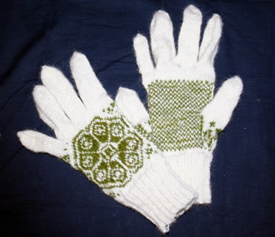 Lanka ja langan menekki Garnstudio Drops Alpaca (100 % alpaca wool; 50 g = 180 m), luonnonvalkoinen (väri 0100), 100 g Garnstudio Drops Alpaca, vihreä (väri 7238), 50 g Jos olet pienikätinen etkä halua pitkiä resoreita, 50 g pääväriä riittää todennäköisesti. Pitkäsormisen tarvitsee neuloa toisesta kerästä muutaman sormen verran. Neuletiheys 36 s sileää kirjoneuletta = 10 cm Puikot Sukkapuikot 2 mm tai käsialan mukaan Koko Nainen, kämmenen ympärys noin 18 cm