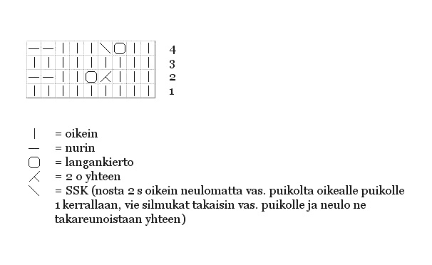 Aloita mallineule. Kavenna ensimmäisellä kerroksella 1. puikolta 1 - 0 - 1 - 0 silmukkaa. Mallineule (ks. myös kaavio)