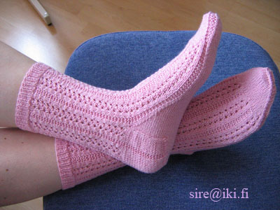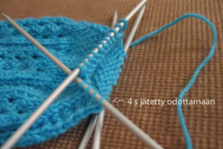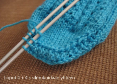 Jatka kantapään kavennuksia, kunnes kantapäässä on 15 - 15 - 20 - 20 silmukkaa, olet neulonut viimeksi nurjan kerroksen ja reunoilla ei ole yhtään silmukoita jäljellä. KiilakavennuksetNosta 1 s neulomatta, neulo 14 - 14 - 19 - 19 s oikein ja poimi kantalapun reunasta 11 - 13 - 15 - 17 silmukkaa. Jatka 3. ja 4. puikoilla mallineuletta (1. tai 3. krs eli kaikki silmukat oikein). Poimi kantalapun reunasta 11 - 13 - 15 - 17 s 1. puikolle ja neulo 7 - 7 - 11 - 11 s 2. puikolta 1. puikolle. Neulo 2. puikon silmukoilla oikein, kunnes jäljellä on 3 silmukkaa, neulo 2 s takareunoista oikein yhteen, 1 oikein. Jatka 3. ja 4. puikolla mallineuletta. Neulo 1. puikolla 1 o, 2 o yhteen, loput silmukat oikein. Neulo 2. ja 1. puikoilla kiilakavennukset joka 2. krs, kunnes silmukoita on jäljellä 40 - 53 - 61 - 70. Huom! 2. puikolle tulee koossa 27 ja 36 yhden silmukan kavennus enemmän kuin puikolle 1. JalkateräJatka 1. ja 2. puikoilla sileää neuletta ja 3. ja 4. puikoilla mallineuletta. Aloita kärkikavennukset, kun sukan pituus on 14 - 18 - 17,5 - 20 cm ja kun olet viimeksi neulonut mallineuleen 1. tai 3. kerroksen. KärkikavennuksetNeulo sukan kärkeen nauhakavennus siten, että sukan reunassa kulkeva 2 silmukan aina oikein -raita jatkuu myös kavennusten ajan. Nauhakavennuksessa kavennuskohdat ovat joka toisella puikolla puikon alussa ja joka toisella puikolla puikon lopussa. Koko 27*Neulo 1. puikolla kahden noston kavennus, loput silmukat oikein. Neulo 2. puikolla oikein, kunnes jäljellä on 2 s, neulo 2 o yhteen. Neulo puikoilla 3 ja 4 mallineuletta. Neulo seuraava kerros oikein.* Toista *-* vielä 1 kerran. Neulo 1. puikolla kahden noston kavennus, loput silmukat oikein. Neulo 2. puikolla oikein, kunnes jäljellä on 2 s, neulo 2 o yhteen. Neulo 3. ja 4. puikoilla mallineuleen kerroksen 2. tai 4 mukaisesti, mutta jätä langankierrot tekemättä. Neulo seuraava kerros oikein. Koko 36Neulo 1. puikolla kahden noston kavennus, loput silmukat oikein. Neulo 2. puikolla oikein, kunnes jäljellä on 2 s, neulo 2 o yhteen. Neulo 3. ja 4. puikoilla mallineuletta. Neulo seuraava kerros oikein. Neulo 1. puikolla kahden noston kavennus, loput silmukat oikein. Neulo 2. puikolla oikein kunnes jäljellä on 2 s, neulo 2 o yhteen. Neulo 3. ja 4. puikoilla mallineuleen kerroksen 2. tai 4 mukaisesti, mutta jätä langankierrot tekemättä. Neulo seuraava kerros oikein. Koko 38*Neulo 1. puikolla kahden noston kavennus, loput silmukat oikein. Neulo 2. puikolla oikein, kunnes jäljellä on 2 s, neulo 2 o yhteen. Neulo 3. ja 4. puikoilla mallineuletta. Neulo seuraava kerros oikein.* Toista *-* vielä 3 kertaa. Neljäs kavennuskerros: Neulo 1. puikolla kahden noston kavennus, loput silmukat oikein. Neulo 2. puikolla oikein, kunnes jäljellä on 2 s, neulo 2 o yhteen. Neulo 3. ja 4. puikoilla mallineuleen kerroksen 2. tai 4 mukaisesti, mutta jätä langankierrot tekemättä. Neulo seuraava kerros oikein. Koko 41Neulo 1. ja 2. puikoilla sileää oikeaa. Neulo 3. ja 4. puikoilla mallineuleen kerroksen 2. tai 4 mukaisesti, mutta jätä langankierrot tekemättä. Neulo seuraava kerros oikein. Kaikki kootKavenna kaikilla puikoilla joka toisella kerroksella seuraavasti: tee 1. puikolla kahden noston kavennus, loput silmukat oikein. Neulo 2. puikolla oikein, kunnes jäljellä on 2 s, neulo 2 o yhteen. Neulo 3. puikolla 2 n, tee kahden noston kavennus, loput silmukat nurin. Neulo 4. puikolla oikein, kunnes jäljellä on 4 s, neulo 2 o yhteen, 2 n.