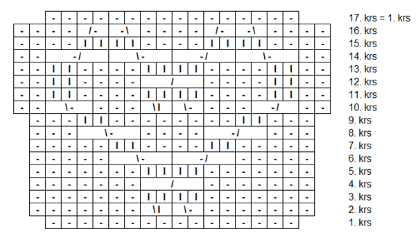 - Neulo 1. puikolla 2 s oikein ja aloita sitten sydänmallineule. Mallineuleen leveys tässä vaiheessa on 18 silmukkaa. Jatka lopuilla 12 silmukalla joustinta.