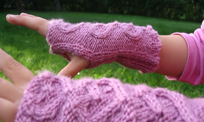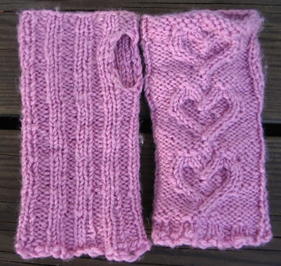 Tein rannekkeita lahjaksi roosasta Novitan Woolista. Aina kaiken huomaava pikkuapulainen ihasteli niitä ja halusi sovittaakin. Lankaa jäi kahdesta kerästä vielä reilusti yli, joten tein tyttöselle lopuista lapaset. Pettymys oli melkoinen, kun vastaanottaja huomasi, että lapasissa olikin kärjet ja peukalot. Niissä piti kuulemma olla peukalolle vain aukko! Mitäpä äiti ei lapsensa eteen tekisi? Siispä seuraavaksi puikoille rannekkeet, edelleen samasta langasta. Nelivuotiaan pikkuprinsessani mieltymykset tuntien suunnittelin rannekkeisiin pienet sydämet. Näistä tulikin niin mieleiset, että ensimmäinen yö nukuttiin rannekkeet kädessä!