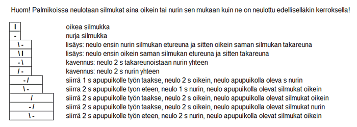 Sydänmallineuleessa neulotaan palmikonkiertojen silmukat aina siten, kuin ne on neulottu edelliselläkin kerroksella, nurjat nurin ja oikeat oikein.